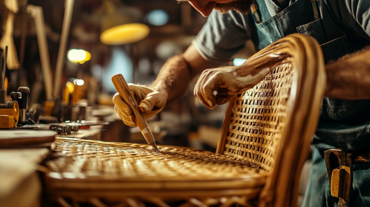 Una vez que la silla está limpia y seca, conviene realizar una revisión minuciosa de toda la estructura para identificar posibles áreas que requieran atención adicional. Esta inspección debe centrarse en verificar que todas las reparaciones previas estén completamente consolidadas y que el pegamento de madera utilizado haya fraguado correctamente. Las zonas donde se han insertado nuevas lengüetas de mimbre merecen especial atención, asegurándose de que estén firmemente integradas al patrón de tejido original. Si se detectan fibras sueltas o bordes levantados, es el momento de corregirlos antes de proceder con el barnizado. Además, conviene palpar suavemente toda la superficie para detectar asperezas que puedan lijarse ligeramente con papel de lija de grano muy fino. Esta inspección garantiza que el barniz se aplicará sobre una base sólida y uniforme, lo que resulta esencial para lograr un acabado profesional y duradero en el tiempo.